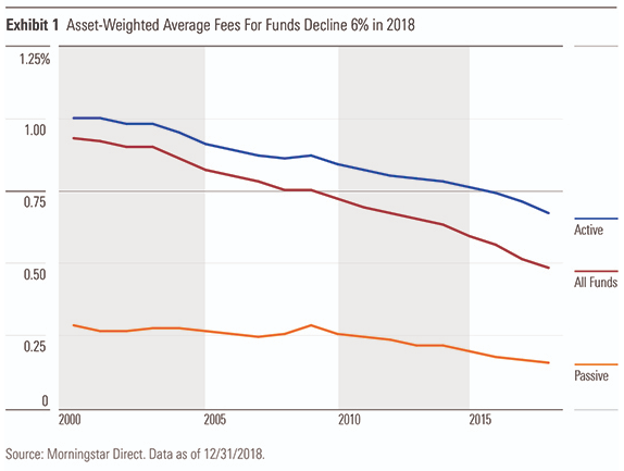 As investing has moved more from a narrative-based out-performance story to a commodity needed for effective financial planning, we’ve gotten to observe fund fees coming down across the industry. This is a great thing! The following table, from Morningstar’s annual fee study, I find to be particularly exciting.