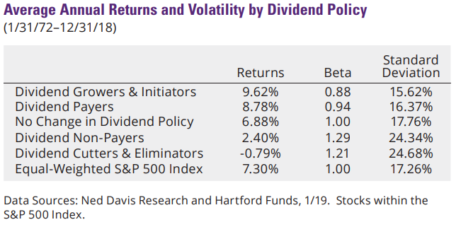 I’d like to draw your attention to the columns Beta and Standard Deviation. These are two measures of volatility - the lower they are, the less volatility one should hypothetically have. As you can see, dividend growers and initiators have the lowest measures of volatility amongst the mix here.