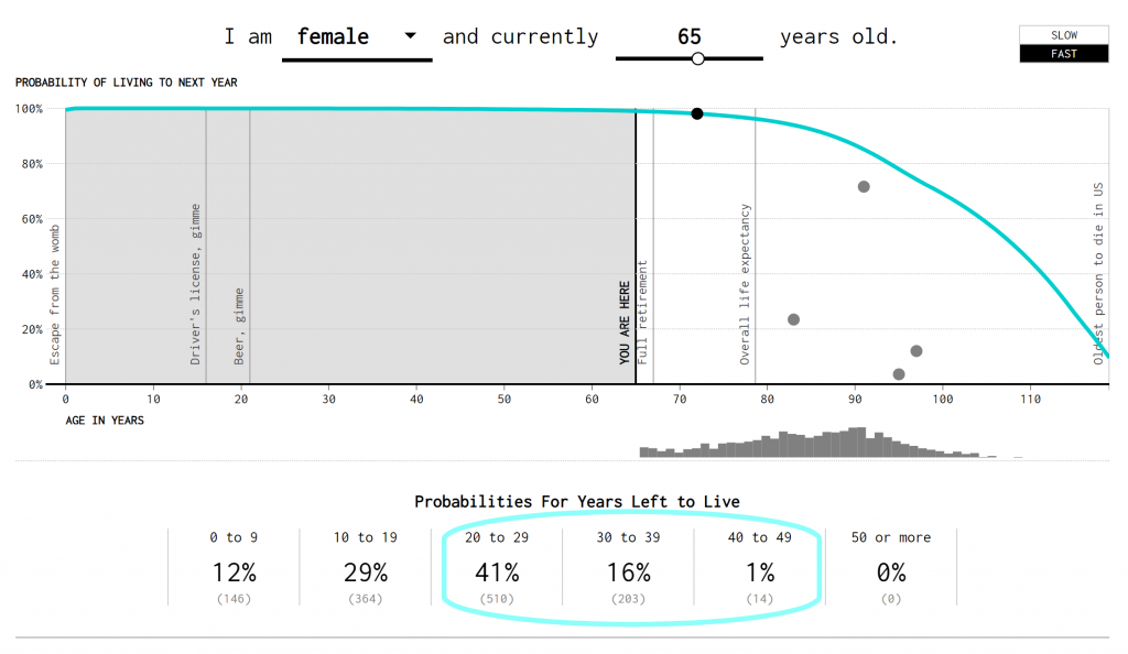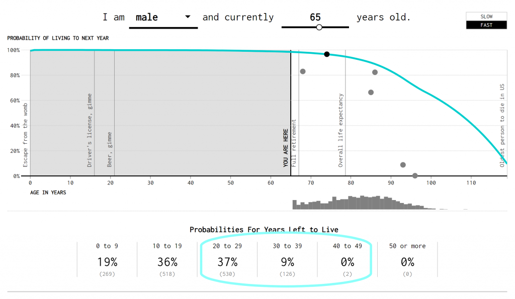 Using life expectancy data from the Social Security administration, Flowing Data created the following interesting visual. I’ve highlighted the “Probabilities for Years Left to Live.” For the average male that is currently 65 years old, approximately 46% will live between 20 and 39 years. A wide range to be sure, but we’re just building an argument here for a moment.