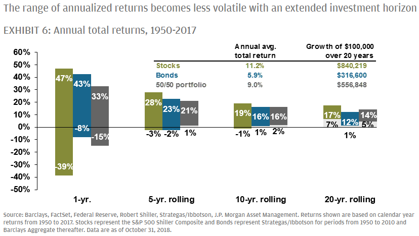 Secondly, we worry about the volatility of the stock market at any given moment because markets collapse quickly and investors often mistake it as a permanent loss of capital. Yet if we look at the long term, such as over the span of the career of today’s retirees, it’s clear that they’re worried about an issue that historically doesn’t even exist. Let’s look at what has historically occurred over various rolling periods in the following chart from JP Morgan.