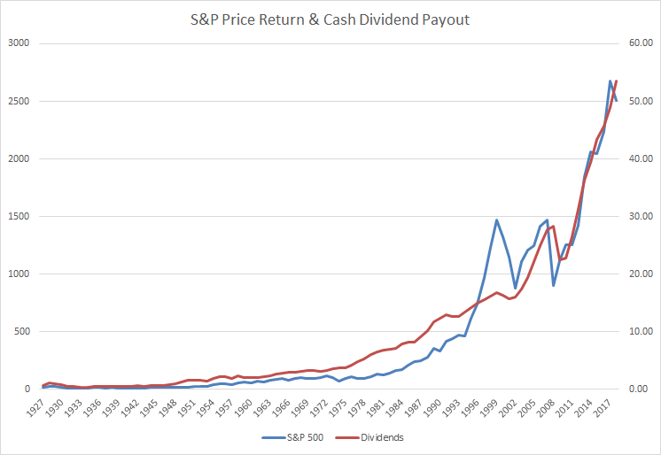 Below is a chart showing the price return of the S&P 500 since 1927 and the dividends paid over that same time. One thing worth noting is the remarkable stability of the cash dividend payment.