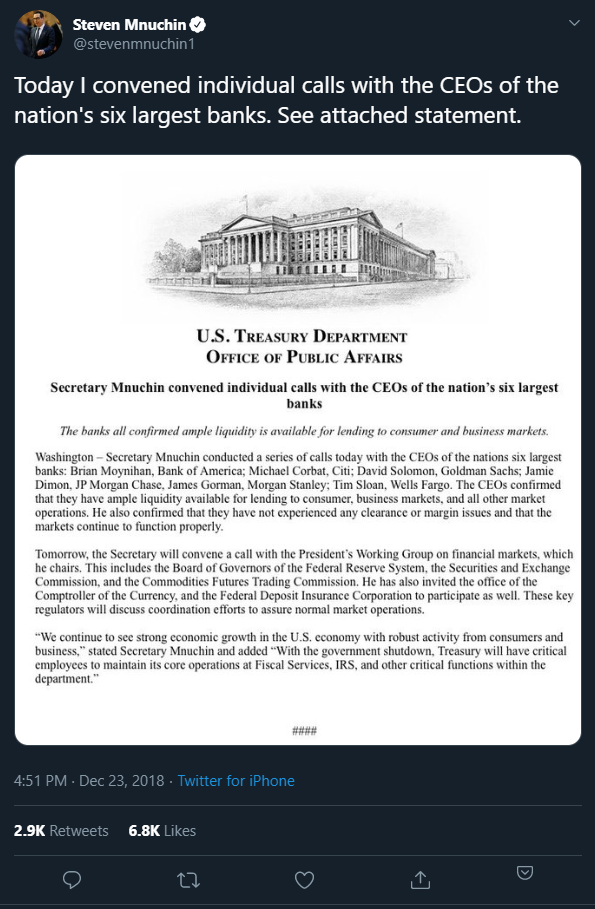 As if those weren’t enough, perhaps the biggest bombshell released was when Treasury secretary, Steve Mnuchin, announced that he held calls with the CEOs of six major banks to ensure their operations were running smoothly and that they had “ample liquidity available for lending.”